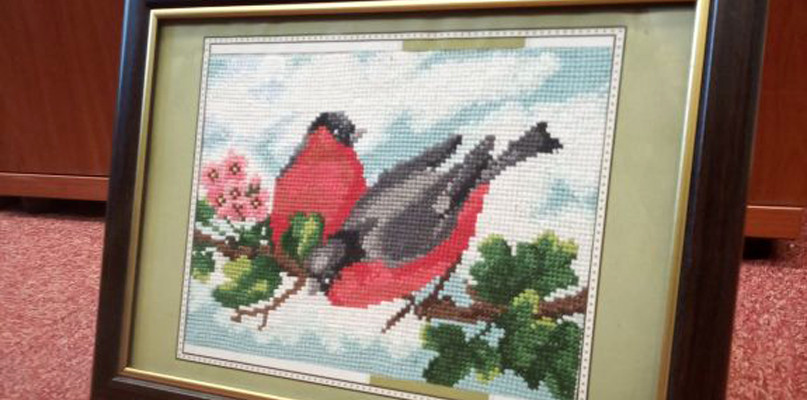 Haftowany obraz w ramce, wyjątkowa drewniana rzeźba ogrodowa, przytulanka szydełkowa.