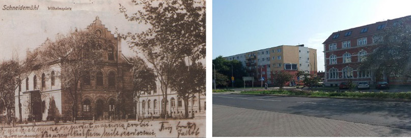 Piła - synagoga: dawniej i dziś (miejsce, gdzie kiedyś stała synagoga). Fot. 1 - domena publiczna; fot. 2 - Henryk Liszkiewicz.