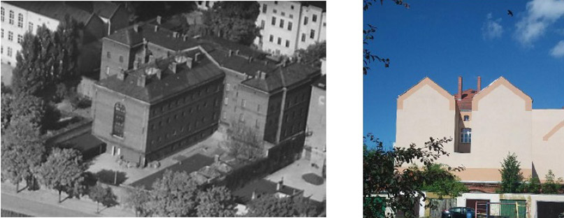 Obecny widok na szkołę z miejsca, gdzie kiedyś było więzienie (fot. archiwalna - domena publiczna; fot. współczesna Henryk Liszkiewicz)