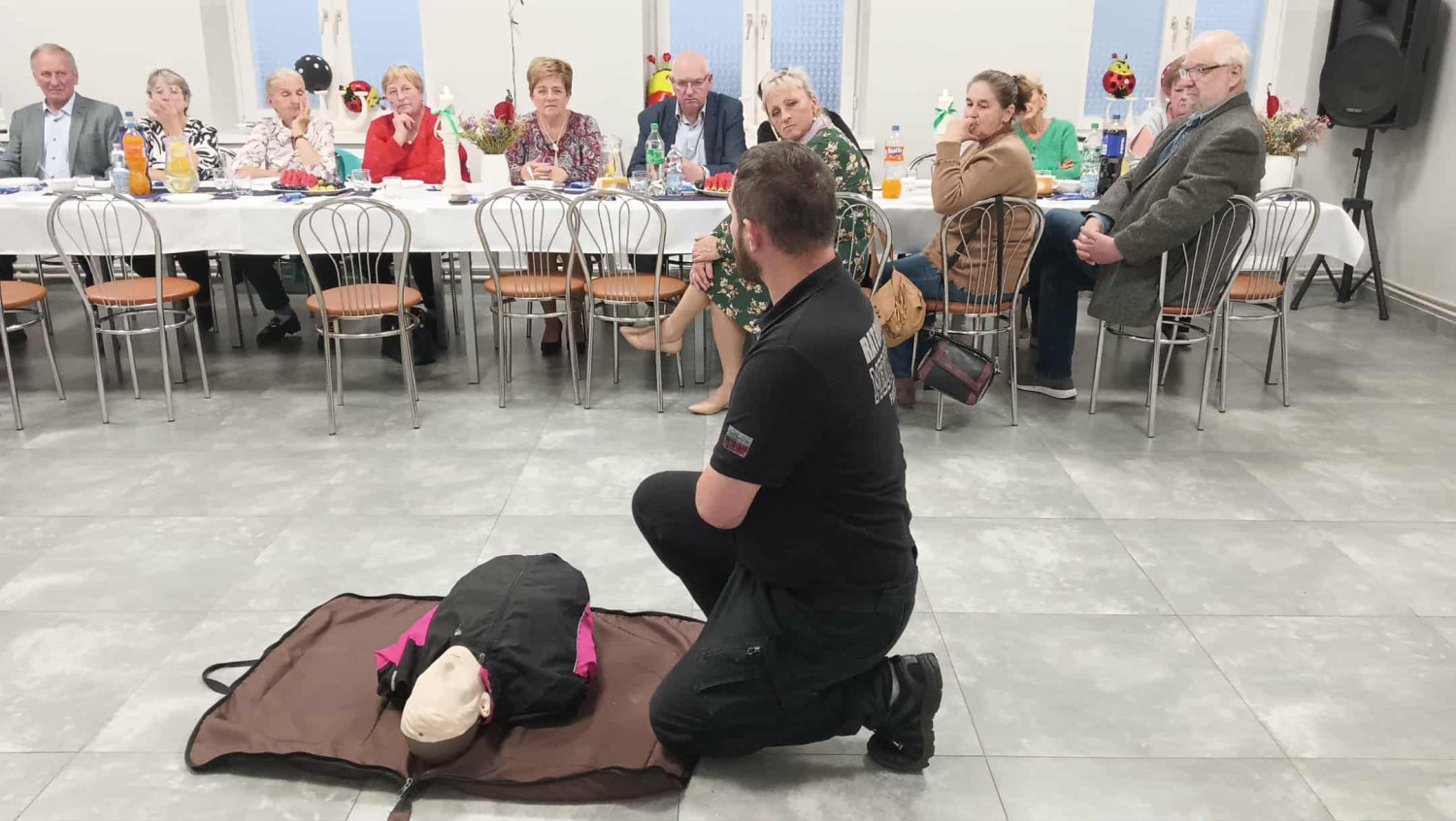 Wspólny posiłek przy stole - najpierw obiad, a w finale kawa i ciasto - to zachęta dla seniorów do wyjścia z domów i spędzenia kilku godzin w miłej, rodzinnej atmosferze. Ale wydarzenie na biesiadzie się nie kończy i jak zawsze ma także walor edukacyjny. Tym razem była nim wizyta Stanisława i Marty Jarosz, ratowników medycznych prowadzących szkolenia z zakresu pierwszej pomocy, bezpieczeństwa i higieny pracy oraz ochrony przeciwpożarowej i ewakuacji.