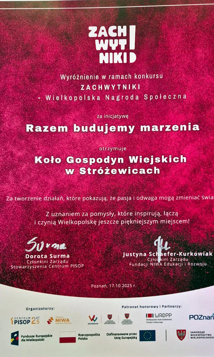 Inicjatywa „Razem budujemy marzenia” otrzymała wyróżnienie za "tworzenie działań, które pokazują, że pasja i odwaga mogą zmieniać świat. Z uznaniem za pomysły, które inspirują, łączą i czynią Wielkopolskę jeszcze piękniejszym miejscem!”.