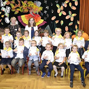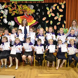 Najważniejszym punktem uroczystości było złożenie przez pierwszoklasistów przysięgi ślubowania. Przyrzeczenie złożone na sztandar szkoły oficjalnie zakończyło okres próby i przypieczętowało przynależność uczniów klas pierwszych do naszej szkoły. Na pamiątkę tego doniosłego wydarzenia dzieci otrzymały dyplomy, legitymacje i logo swojej szkoły. Rodzice i Rada Rodziców również ufundowała upominki, które bardzo podobały się najmłodszym uczniom szkoły. W roli konferansjera doskonale sprawdziła się uczennica klasy 4b Lena Sadłowska. O piękną tematyczną dekorację sali zadbały panie bibliotekarki - Elżbieta Kwasek i Katarzyna Chyła.