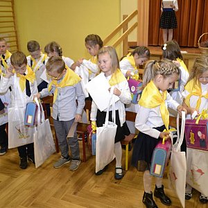 Na początku uroczystości pierwszoklasiści zaprezentowali przed przybyłą publicznością swoje umiejętności artystyczne: recytowali wiersze, śpiewali piosenki, pochwalili się znajomością wierszyków w języku angielskim. Dyrektor szkoły Danuta Buryta-Arndt powitała obecnych gości: burmistrz Wyrzyska Bogusławę Jagodzińską, przewodniczącego Rady Miejskiej w Wyrzysku Stefana Rymera, przewodniczącą Rady Rodziców Edytę Lipkowską, dyrektor SAP w Wyrzysku Magdalenę Strzałkowską, przedstawicielki Stowarzyszenia "Dorośli Dzieciom" działającego przy Szkole Podstawowej w Wyrzysku, licznie przybyłych rodziców, krewnych i oczywiście bohaterów tego dnia - uczniów klas pierwszych wraz z wychowawczyniami: Anną Muszyńską (zastępstwo za Mariolę Królik), Kamilą Pufahl, Edytą Kałużną i Agnieszką Spirydow.