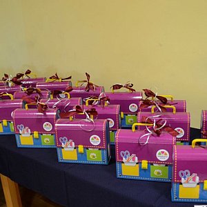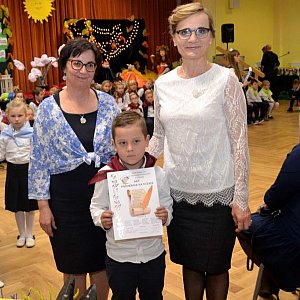 Na zakończenie wszyscy uczniowie otrzymali pamiątkowe dyplomy, logo szkoły i legitymację szkolną. Nie zabrakło też upominków od zaproszonych gości: kochani rodzice ufundowali kuferki z pomocami dydaktycznymi, Rada Rodziców przygotowała koszulki z logo szkoły. Wielką radość sprawiła uczniom niespodzianka od burmistrz Bogusławy Jagodzińskiej, czyli słodkości.