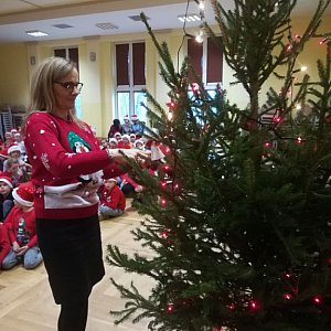 Potem nadszedł czas na ozdobienie świątecznego drzewka. Najpierw symboliczne ozdoby - błyszczącą gwiazdkę oraz myszkę - zawiesiła pani dyrektor. Później do choinki podchodziły kolejno dzieci ze swoimi wychowawczyniami: klasy pierwsze przygotowały białe łańcuchy, drugie - gwiazdki, a trzecie - aniołki.