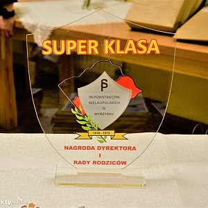 Pani Kornelia Kwasińska podsumowała kolejną edycję konkursu Super Klasa. W tym roku zwycięzcą została klasa Vb. Uczniowie w tym roku otrzymali przechodnią statuetkę w formie tarczy z logo szkoły i pamiątkowe medale.