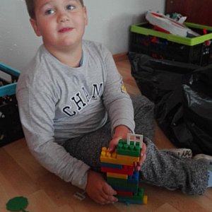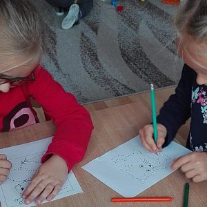 Następnie dzieci szukały kropek w swoim otoczeniu, na ubraniach, zabawkach, książkach itp., tworzyły obrazki za pomocą łączenia kropek. W drugiej części dnia mogły wykazać się swoimi talentami, bo przecież każdy jakiś ma. Nadia pięknie recytuje, Maks, Wojtek i Remik to znakomici piłkarze, Amelka i Lena lepią z plasteliny, Hania pięknie rysuje. Wojtek, Oleg i Maks potrafią z klocków zbudować dom.