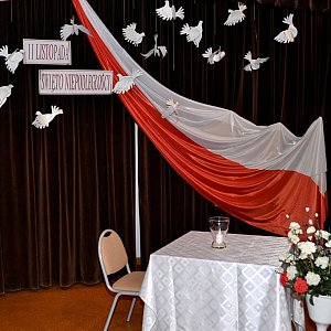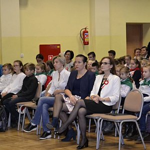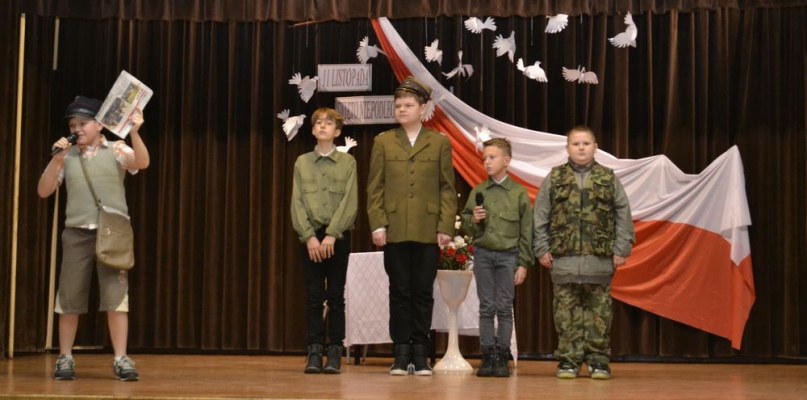 Uroczystość rozpoczęła się wprowadzeniem sztandaru szkoły oraz wspólnym odśpiewaniem hymnu państwowego. Scenariusz montażu słowno-muzycznego obejmował treści historyczne, pieśni i wiersze. W bardzo ciekawy i obrazowy sposób przedstawiono losy naszej Ojczyzny, począwszy od zaborów, a skończywszy na roku 1918. Występ uświetniony został przez niezwykle utalentowaną uczennicę klasy VIc Karolinę Mróz, która zaśpiewała piosenkę harcerską "Gdzie jesteś Rudy, Alku, Zośko?", akompaniując sobie na gitarze.