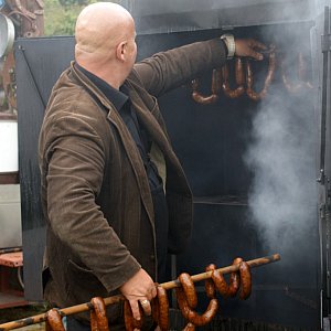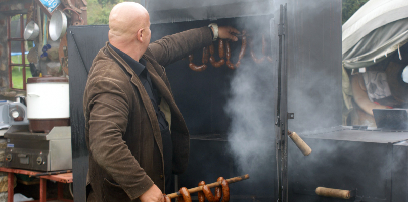 To nie koniec kulinarnych fantazji. Niemałą atrakcją była karkówka z gara, przygotowana przez Janusza w naszej społecznej, mobilnej grillo-wędzarni. Intensywny zapach i ranczerska wizualizacja dania zachęcały do degustacji. Karkówka rozpadała się podczas odrywania kolejnych kęsów mięsa. Z Dragona (Smoka), bo taką nazwę wybrali dla wędzarni uczestnicy, degustowaliśmy kolejno ciepłą, wędzoną i grillowaną kiełbasę ranczerską. Z murowanej wędzarni Janusza na stół wjechały wędzone nóżki drobiowe. Można było również skosztować ziemniaki i kiełbasę z ogniska, przygotowane przez Alfreda Kiestrzyna.