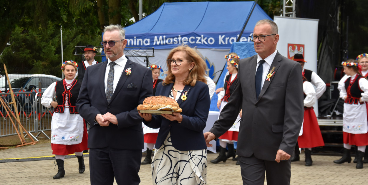 Starostami tegorocznych dożynek byli państwo Dorota i Jarosław Szpotek z Okalińca. To oni przekazali chleb wypieczony z mąki pochodzącej z tegorocznych zbiorów burmistrzowi Krzysztofowi Jackowi Oświecimskiemu.