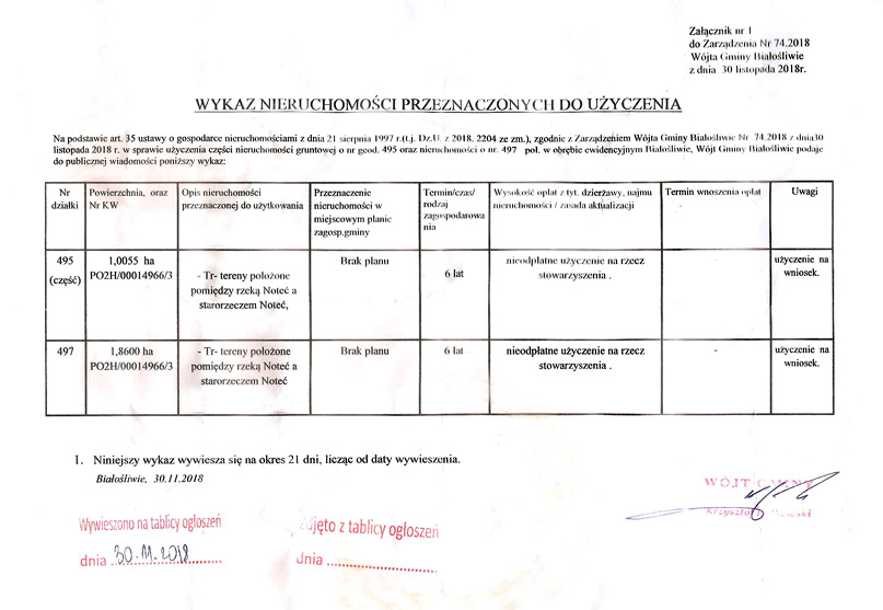 Zarządzeniem z dnia 30 listopada 2018 roku wójt gminy Białośliwie Krzysztof Rutkowski podał do publicznej wiadomości wykaz nieruchomości przeznaczonych do użyczenia. Dotyczył on dwóch sąsiadujących z sobą nieruchomości o powierzchni 1,0055 ha (część działki nr 495) i 1,8600 ha (działka nr 497), położonych pomiędzy rzeką Noteć a jej starorzeczem oraz drogą wojewódzką nr 190. Krzysztof Rutkowski zadecydował o nieodpłatnym użyczeniu obu nieruchomości Stowarzyszeniu "Stara Noteć Białośliwie".