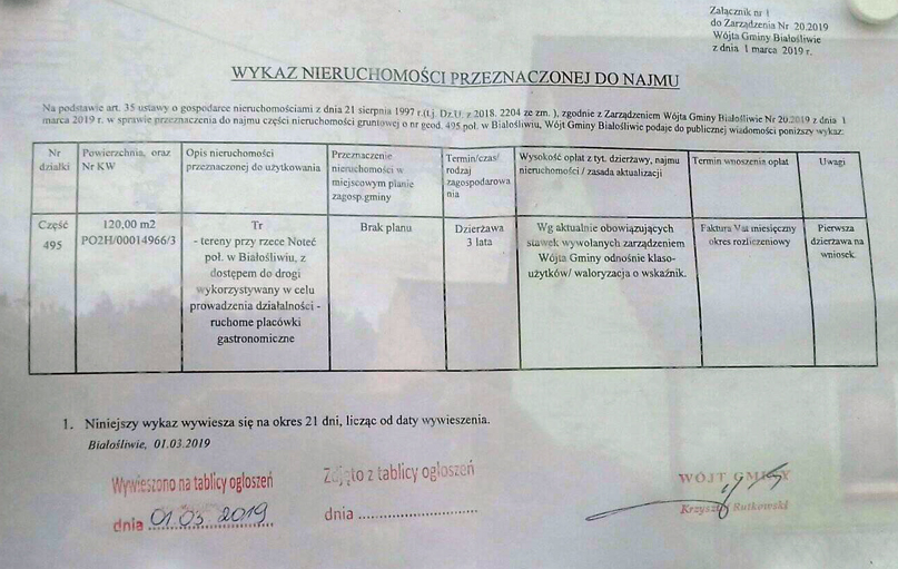 1 marca 2019 roku wójt Białośliwia wydał kolejne zarządzenie. Tym razem dotyczy ono przeznaczenia do najmu pozostałej części działki nr 495 o powierzchni 120 metrów kwadratowych. Teraz w przeznaczeniu do użytkowania wpisano "prowadzenie działalności - ruchome placówki gastronomiczne".