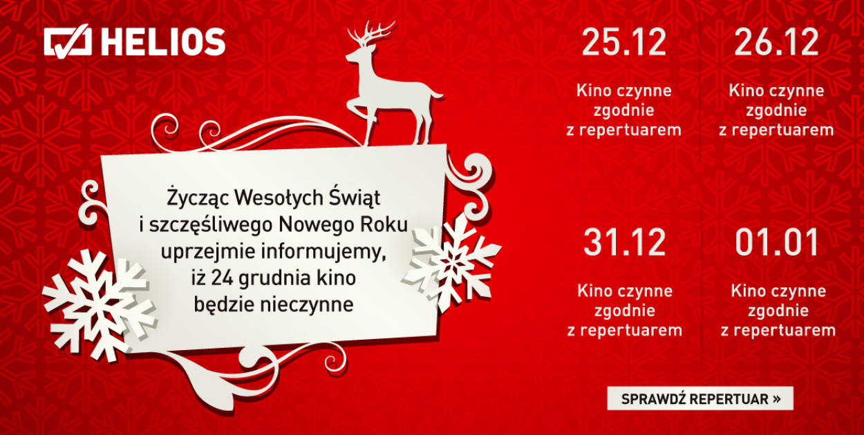 Przełom roku to doskonały moment na wizytę w kinie w gronie najbliższych i przyjaciół! Szczegóły dotyczące seansów dostępnych w aktualnym repertuarze można znaleźć na stronie www.helios.pl, w aplikacji mobilnej oraz w kasach kin Helios w całej Polsce.