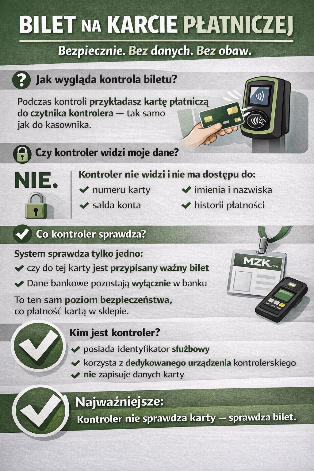Kupując bilet w kasowniku nie uzyskamy wydruku; bilet zostaje przypisany odpowiednio do użytej karty. Podczas kontroli należy tę kartę przyłożyć do czytnika kontrolerskiego. Gwarantujemy pełne bezpieczeństwo transakcji - podczas kontroli biletów czytnik nie ma dostępu do banku ani żadnych danych bankowych posiadacza karty, a jedynie na podstawie odczytanego w bezpieczny sposób numeru karty uzyskuje informację z bazy przewoźnika o zakupionych za jej pomocą biletach.