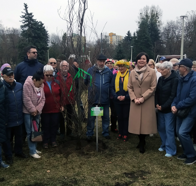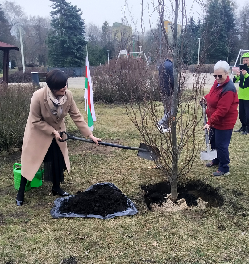 W ruch poszły łopaty, potem konewka by podlać świeżo posadzone drzewko, osadzono pamiątkową tabliczkę i ozdobiono pień drzewa zieloną kokardą, kolorem budzącej się do życia wiosny.