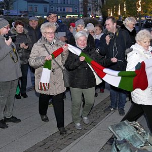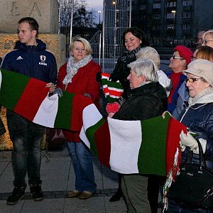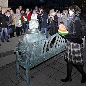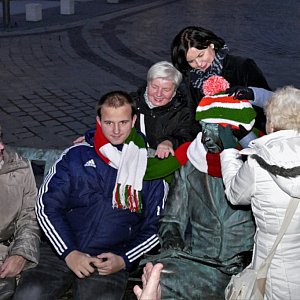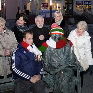 Panie z Centrum Aktywizacji Osób Starszych i Niepełnosprawnych przerobiły motki na ciepły szalik dla najsłynniejszego pilanina. I jeszcze starczyło na czapkę z pomponem! A że szal jest długi, gość przysiadający na pomnikowej ławeczce także może się nim otulić.
