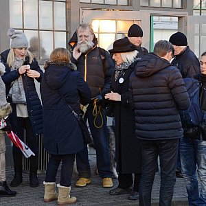 Przyszliśmy na dworzec letni jako pierwsi, ale zaraz dołączyli do nas kolejni sympatycy KOD, a właściwie grupy "Dogadajmy się". Przybiegła nawet pani, która mimo deklaracji nie mogła pojechać; zamiast niej wzięliśmy przepyszny keks, przygotowany specjalnie na tę okazję.