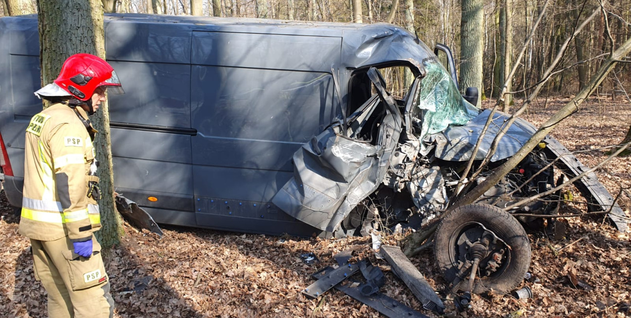 Na drodze krajowej nr 11 w okolicy Budzynia kierowca busa zjechał z jezdni i uderzył w drzewo.