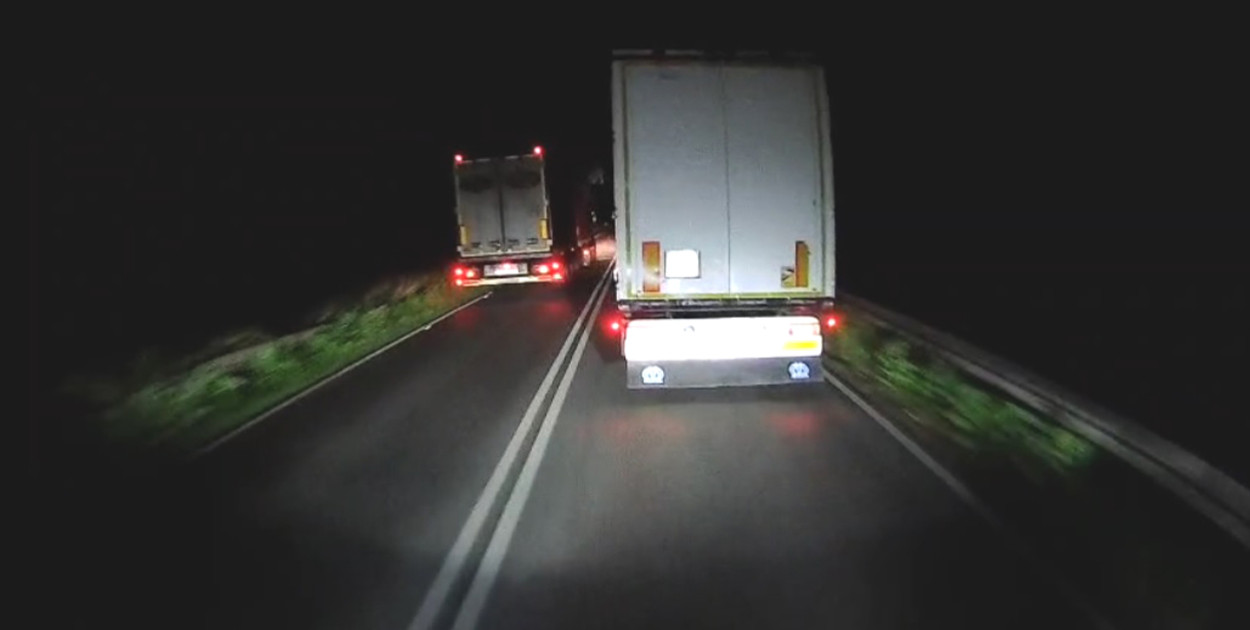 Pierwszy filmik obrazuje sytuację w Nieżychowie kilkanaście sekund przed godziną pierwszą w nocy. Pirat w tirze wyprzedza pod prąd, z lewej strony wysepki i na podwójnej ciągłej, kierowcę innego samochodu ciężarowego.