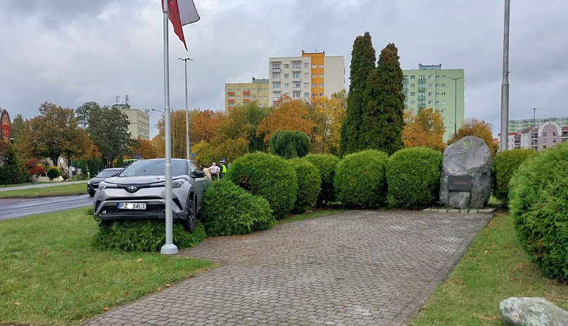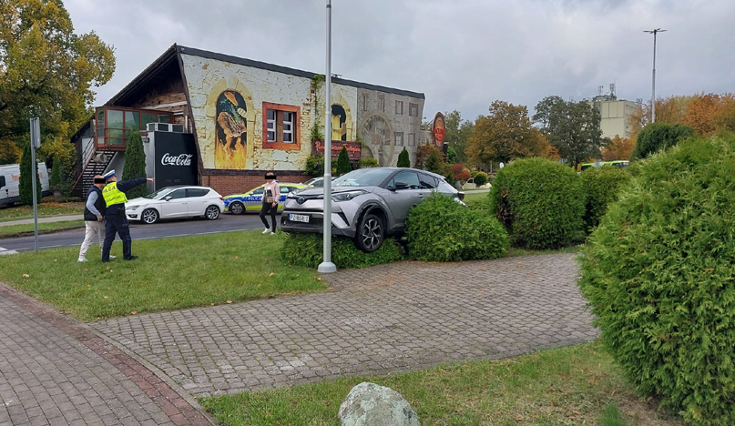 Auto zawisło na rosnących tam krzewach, zatrzymując się tuż przed masztem z flagą.