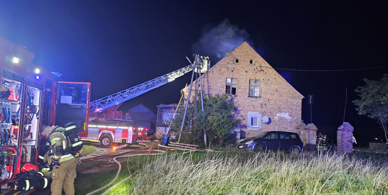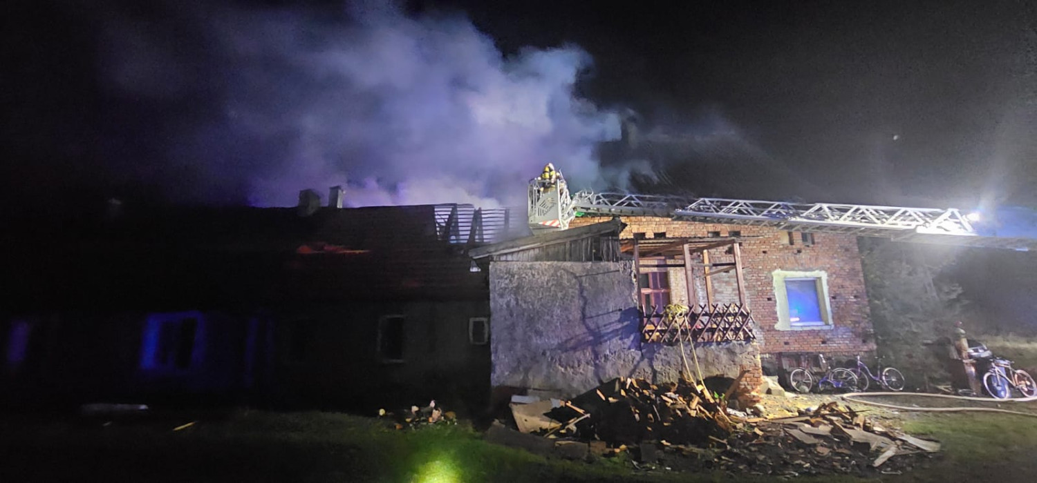 Po przybyciu na miejsce zdarzenia zastępów straży pożarnej stwierdzono, że pożarem objęty jest dach i poddasze budynku wielorodzinnego parterowego.
