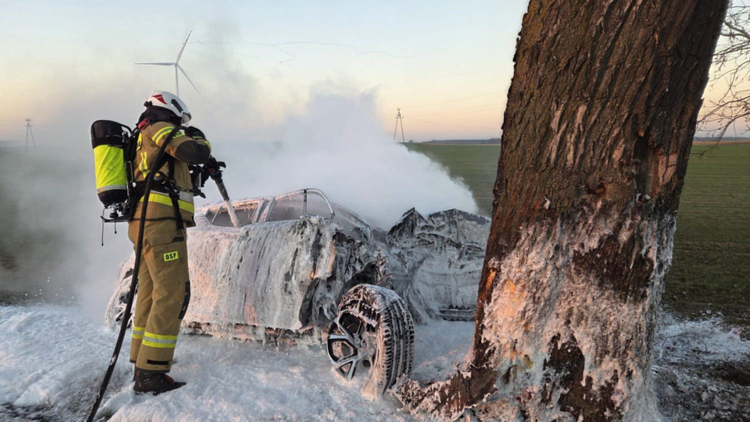 Na miejscu stwierdzono pożar samochodu osobowego w wyniku uderzenia w przydrożne drzewo. Ciężko poszkodowana została jedna osoba, którą przetransportowano ambulansem do szpitala.