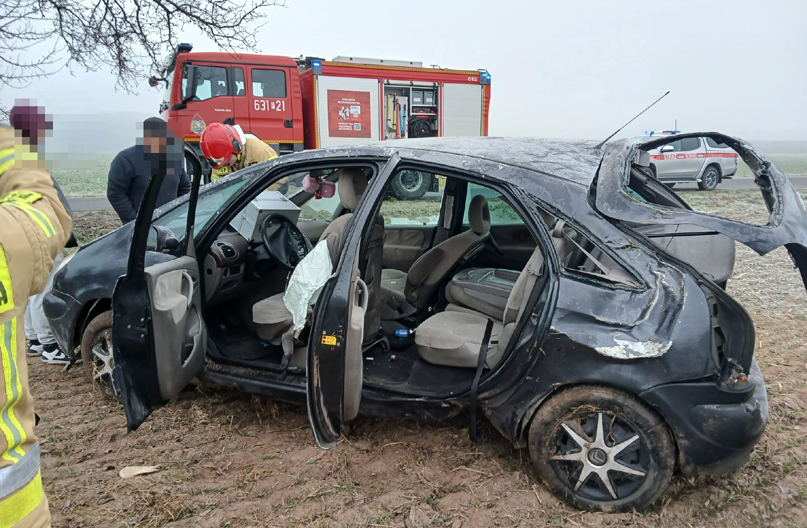 Po przybyciu pierwszych zastępów na miejsce zdarzenia ustalono, że auto znajduje się poza jezdnią i leży na boku. Osoba poszkodowana była na zewnątrz.
