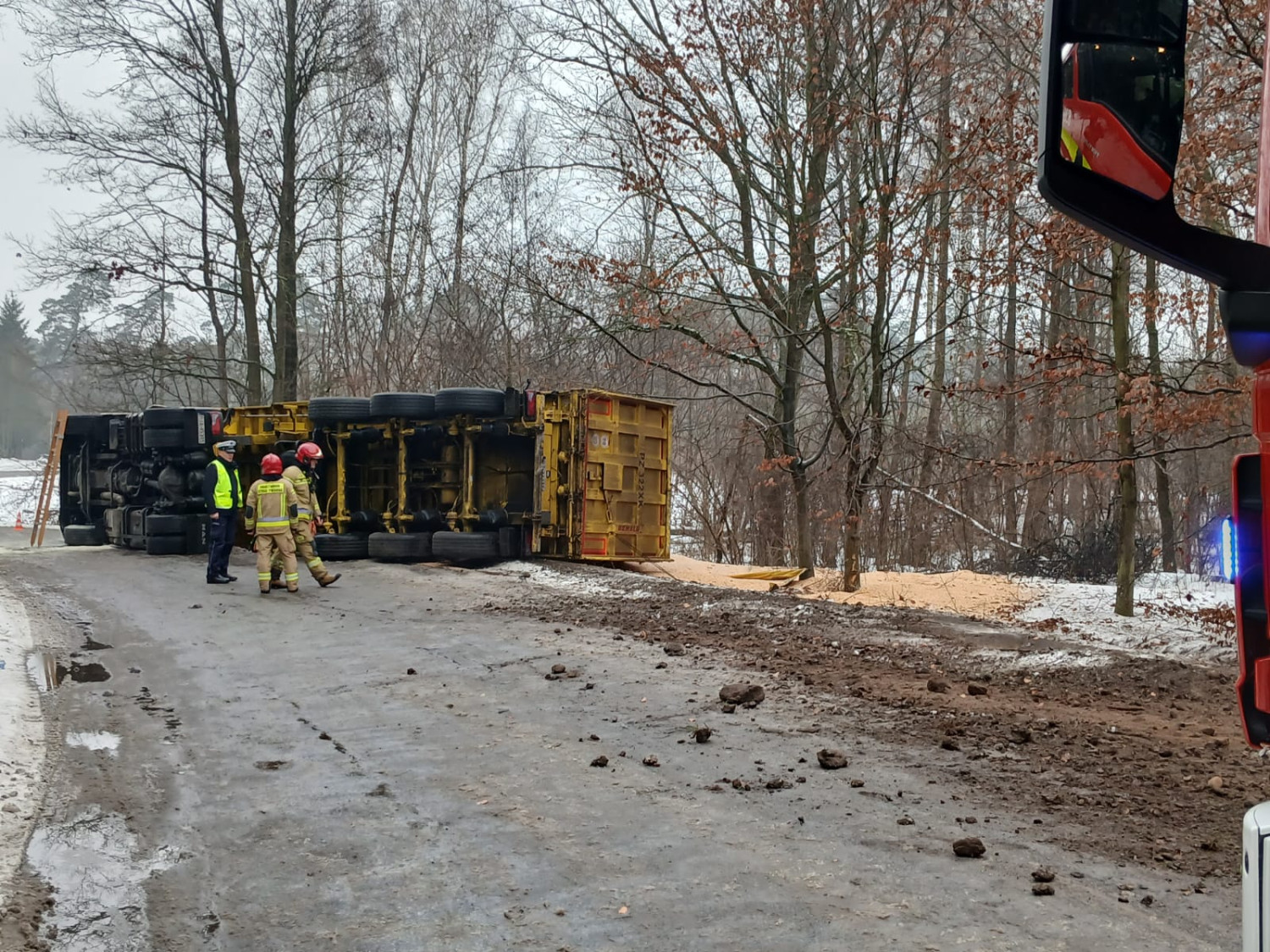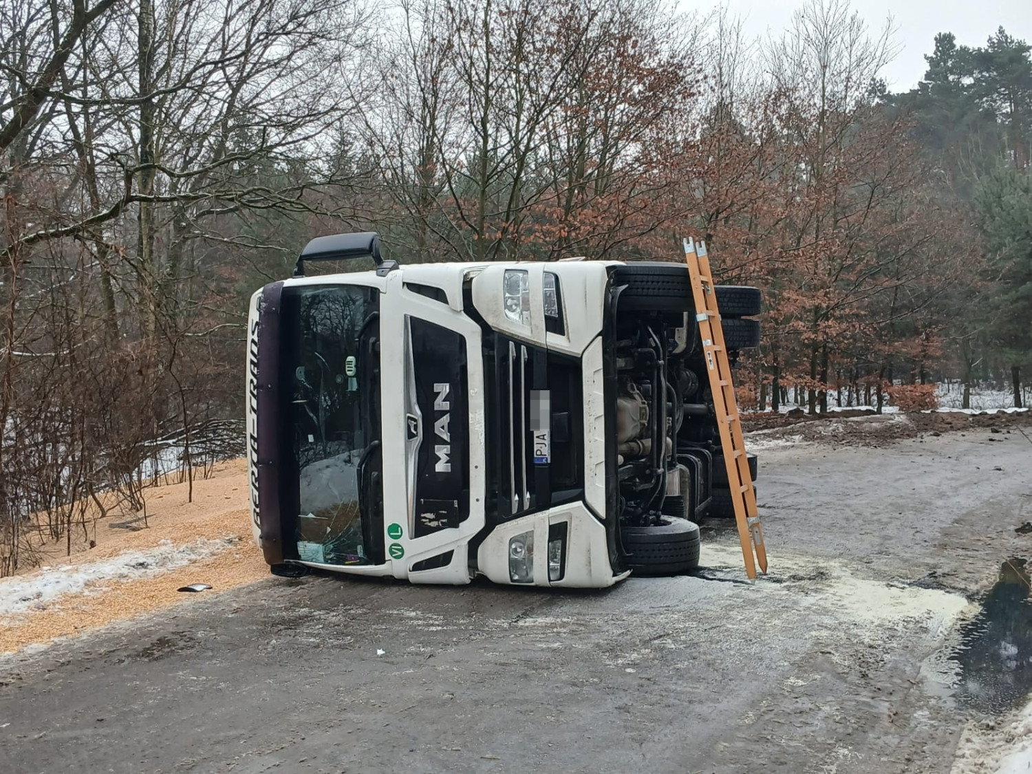 Trzy dni temu na drodze z Mieściska w stronę Zakrzewa samochód przewożący kukurydzę wpadł w poślizg i przewrócił się na bok.