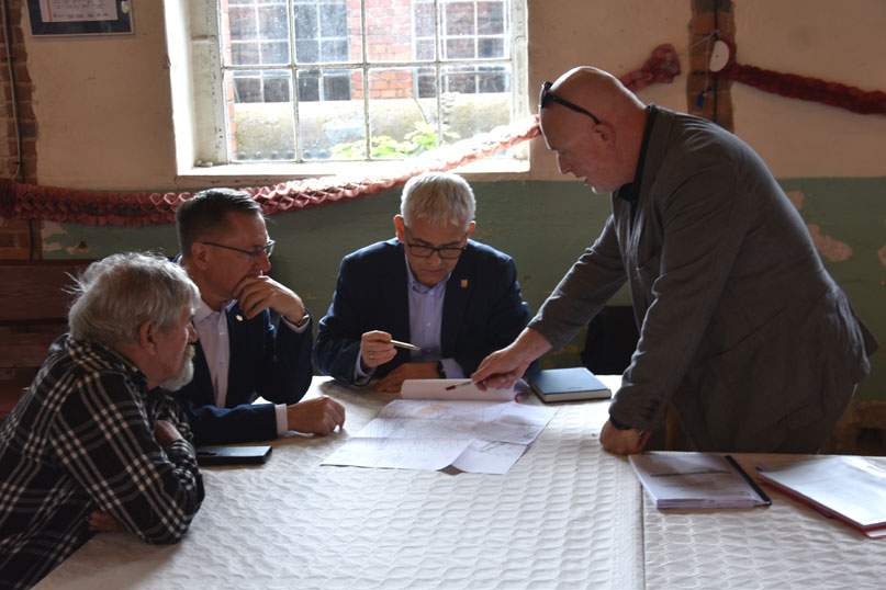 Pracom przyglądali się starosta pilski Rafał Zdzierela oraz poseł Piotr Głowski. Przemysław Kusz z Powiatowego Zarządu Dróg, który z ramienia powiatu pilotuje działania związane z rewitalizacją wąskotorówki, przedstawił plan przebudowy dawnej stolarni na świetlicę.