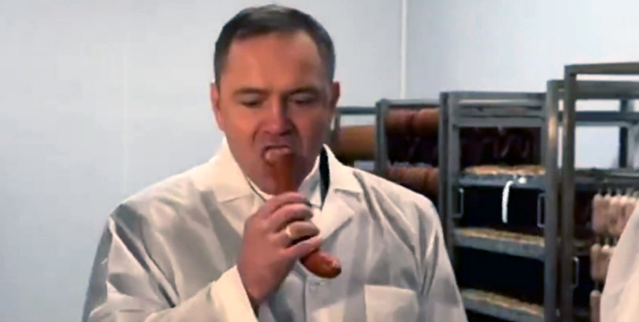 Kiedy trzeba pan Karol gryźnie sobie kiełbasę. "Czujną i czosnkową", jak w "Chłopach " Reymonta.
