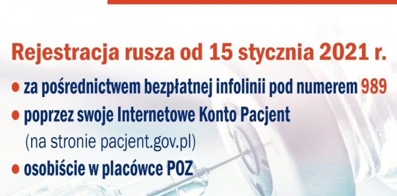 22 stycznia zarejestrować się będą mogły osoby, które ukończyły 70 lat. Szczepienia dla zarejestrowanych seniorów rozpoczną się 25 stycznia. Na szczepienia można zarejestrować się na 3 sposoby: zadzwoń na całodobową i bezpłatną infolinię 989; poprzez e-Rejestrację dostępną na pacjent.gov.pl; skontaktuj się z wybranym punktem szczepień.
