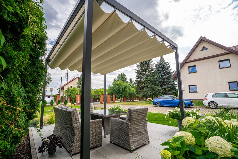 Kolor ma ogromne znaczenie. Białe i szare pergole są uniwersalne. Czarne dodają elegancji ale nagrzewają się bardziej.